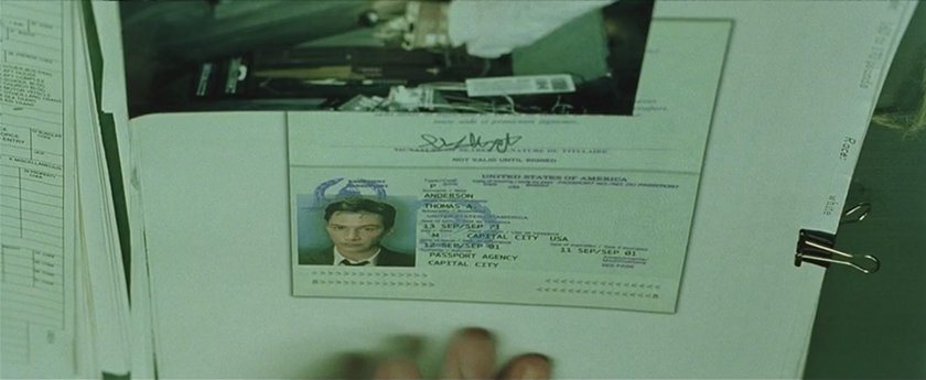 Это сцена проверки документов у Нео Агентом Смит фильма "Матрица" - 1999 года (<666|>)